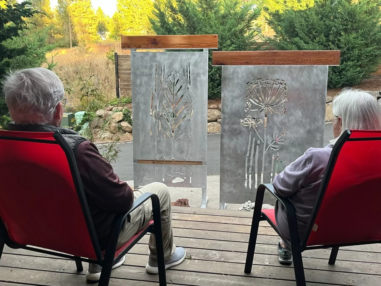 A person is welding a metal panel with a cut-out design, sparks flying from the welding process.